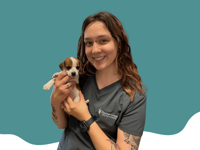 Shelbie Corber is from Topeka, Kansas. She graduated from Washburn Rural High School in 2014. Shelbie is happily married to her best friend, George. Their blended family consists of their four children: Tyler, Sam, Lucas, and Lillie, their two grandchildren: Harmony and Heaven, as well as their two dogs: Jax and Scrappy, and three cats: Kairi, Gir, and Shaggy. Shelbie began working for Banner Creek Animal Hospital in July 2023 as a Receptionist. Her pastimes include cooking, writing, and going on outdoor adventures with her husband.